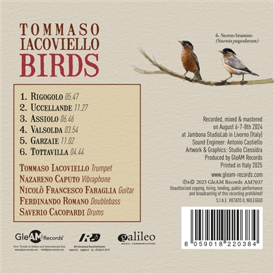 „BIRDS” ist das Debütalbum des Trompeters Tommaso Iacoviello. Es ist eine Einladung, die Natur nicht nur zu betrachten, sondern auch zu hören und zu spielen. Mit seinem Quartett hat er versucht, die intimsten Nuancen der uns umgebenden Klanglandschaften einzufangen und sie in originelle Kompositionen zu verwandeln.