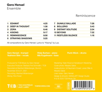 Gleichzeitig geheimnisvoll und energiegeladen – Trompeter Gero Hensel eröffnet „Reminiscence“ – ein Album voller Momente, Erinnerungen und Erlebnisse, eingefangen in Musik. Die Kompositionen auf „Reminiscence“ stammen aus der Feder von Gero Hensel und zeichnen sich durch Einflüsse außerhalb des Jazz aus, die sich in Anleihen bei klassischen Komponisten wie Modest Mussorgsky („Straying Shadows“) oder Béla Bartók („Beyond“) zeigen. Form, Akkordstrukturen und Motive aus der Welt der klassischen Musik werden aufgegriffen, verarbeitet, verfremdet und mit der Ästhetik des Jazz kombiniert. Das Ergebnis sind komplexe und vielschichtige Kompositionen, die sich von den Normen des Jazz lösen. „Reminiscence“ zeigt Gero Hensels Wagemut, seine Neugier und Offenheit für neue musikalische Ideen, aber vor allem offenbart Gero Hensel das außergewöhnliche zentrale Element seiner Musik, das sich durch das gesamte Album zieht: den Klang. Mit seinen Mitmusikern – Yeahwon Shin (Gesang), Vitaly Burtsev (Klavier), Nils Kugelmann (Kontrabass) und Flurin Mück (Schlagzeug) – sind sie ein wesentlicher Teil davon. Sie sind eng mit der Musik und den Kompositionen verbunden: Ihr facettenreiches Spiel, ihr ausdrucksstarker Klang sowie ihre musikalische Individualität und Offenheit tragen dazu bei, die Musik zu definieren und zu bereichern.