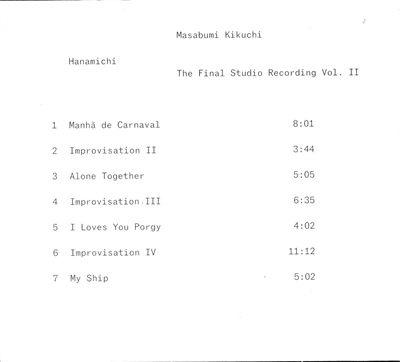 Die sieben Titel der Vol. II umfassen mehr als 43 Minuten Musik, darunter Kikuchis transformative Interpretationen von „Manhã de Carnaval“, „Alone Together“, „I Loves You Porgy“ und „My Ship“ – Songs, die eng mit seinen prägenden Jahren als Musikstudent in Tokio in den späten 1950er-Jahren verbunden sind. Dazwischen sind drei seiner charakteristischen Improvisationen eingeflochten, die der Kritiker Ben Ratliff in seinen Liner Notes als „"instant ballads from another planet“ beschreibt. Sie demonstrieren Kikuchis bemerkenswerte Fähigkeit, Musik zu schaffen, die „nicht auf musikalische Auflösungen zusteuert, sondern nach außen drängt“.