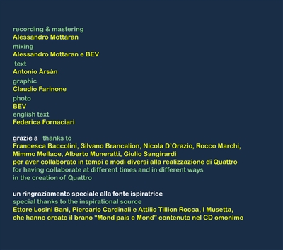 „Quattro“ ist eine Hommage an eine ihrer Inspirationsquellen: die Musik und Instrumente, die durch die Täler und Berge der nordwestitalienischen Region „Quattro Province“ am Beginn der Apenninen erklingen. Das Album besteht aus elf Titeln, darunter zwei traditionelle Stücke (Mond e Pais e Mond und Quattro). Die übrigen Kompositionen hauchen traditionellen Tänzen wie Perigordini, Alessandrine und Monferrine (Lingua Madre, Leb, 5&6, O Xaia) neue Melodien ein oder adaptieren erzählerische Elemente im Stil des Volksgesangs – darunter Stranòt oder Serenata – , um persönliche Erfahrungen zu vermitteln (Sull’Alba, Libero Stile, Serenata Controtempo).
