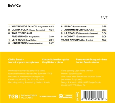 Mit „Five“ lädt uns Bo'n'Co zu einer klanglichen Reise ein, die uns mit jeder Komposition in verschiedene Facetten des zeitgenössischen Jazz entführt. Das Album spielt mit der Kreativität der einzelnen Musiker und umfasst zehn Titel, von denen jeder seine eigene Identität hat. Dennoch spiegeln sie alle den kollektiven Einfluss der Bandmitglieder wider, deren Zusammenhalt schon beim ersten Hören offensichtlich wird. Mit großem Einfallsreichtum demonstrieren die fünf Bandmitglieder eine Verbundenheit, die offenbart, was „Five” bedeutet: die Summe von fünf Stimmen, fünf individuellen Empfindungen und fünf Energien im Dienste eines zutiefst interaktiven Jazz.