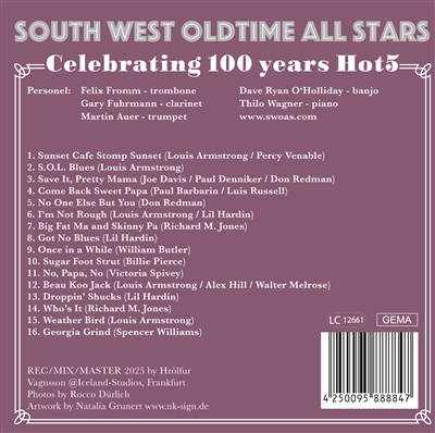 Die „South West Oldtime All Stars“ (SWOAS) haben sich seit ihrer Gründung 2018 mit weit über 200 Konzerten zu einer festen Größe in der europäischen Traditional­-Jazz­-Szene etabliert. Ursprünglich kommen die Musiker aus dem Südwesten (South West) der Republik („The Land“), sind allesamt studierte Jazzmusiker und lieben alle Variationen des „Classic Jazz“. In ihren ersten drei CD­-Einspielungen befasst sich die Band ausschließlich mit dem Repertoire von Louis Armstrongs musikalisch wichtigsten Projekten, den „Hot5“ und „Hot7“ aus der Zeit von 1925 bis 1928 – reine Studioproduktionen, mit denen „Satchmo“ nie auf Tour ging. Mit ihrem neuen Album feiern die SWOAS 100 Jahre Louis Armstrongs „Hot5“ und spielen zahlreiche Konzerte in der „Original­-Hot5“ Besetzung!